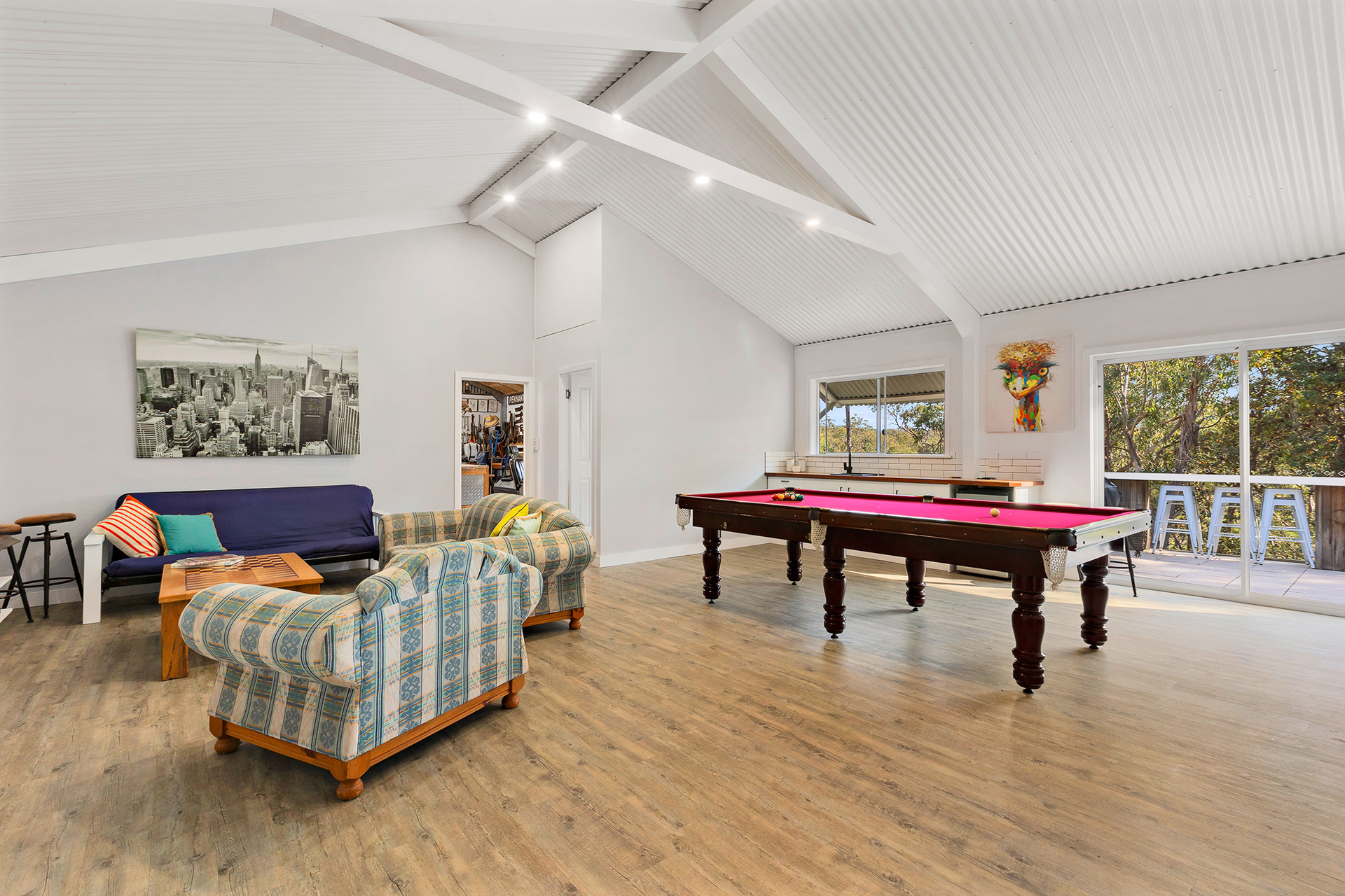 The spacious four-bedroom home is designed for both relaxation and entertainment, featuring three separate living areas perfect for families or hosting guests. You'll love the games room, complete with a wet bar and its own bathroom – ideal for parties, hobbies, or simply unwinding.